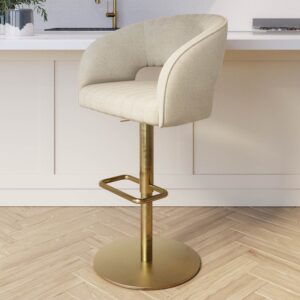 “Curved Beige Upholstered Adjustable Swivel Bar Stool with Gold Base – Runa” has been added to your cart.
