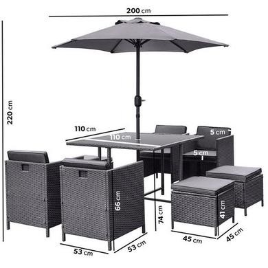 Upgrade your outdoor dining experience with this stylish, compact, 8-seater rattan cube dining set, designed with convenience in mind. The clever cube structure allows you to store the chairs and stools underneath when not in use, saving space and maintaining a tidy outdoor area. Made from high-quality, weather-resistant rattan in a charcoal, contemporary rattan weave, this durable and low-maintenance set is practical, elegant and effortlessly complements any outdoor décor. In addition, the included parasol with crank handle offers shade on sunny days and protection from a light shower and slots easily into the parasol hole in the centre of the table. This garden set is a must-have for any patio, decking, or garden space.
