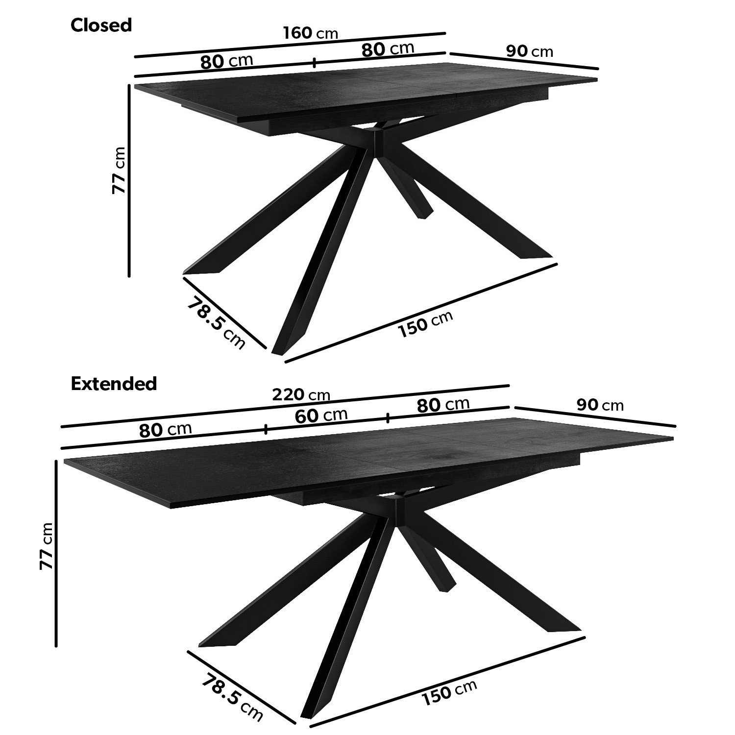 - Dimensions:W160-220 x D90 x H77 cm
