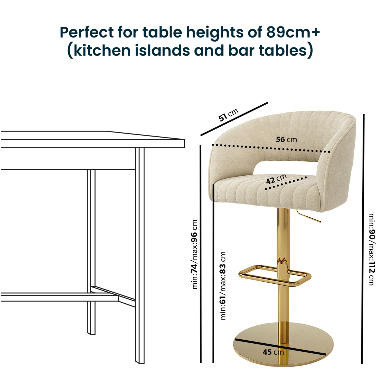 Suitable for bar tables and kitchen islands with heights of 89-109 cm, please measure before purchasing.