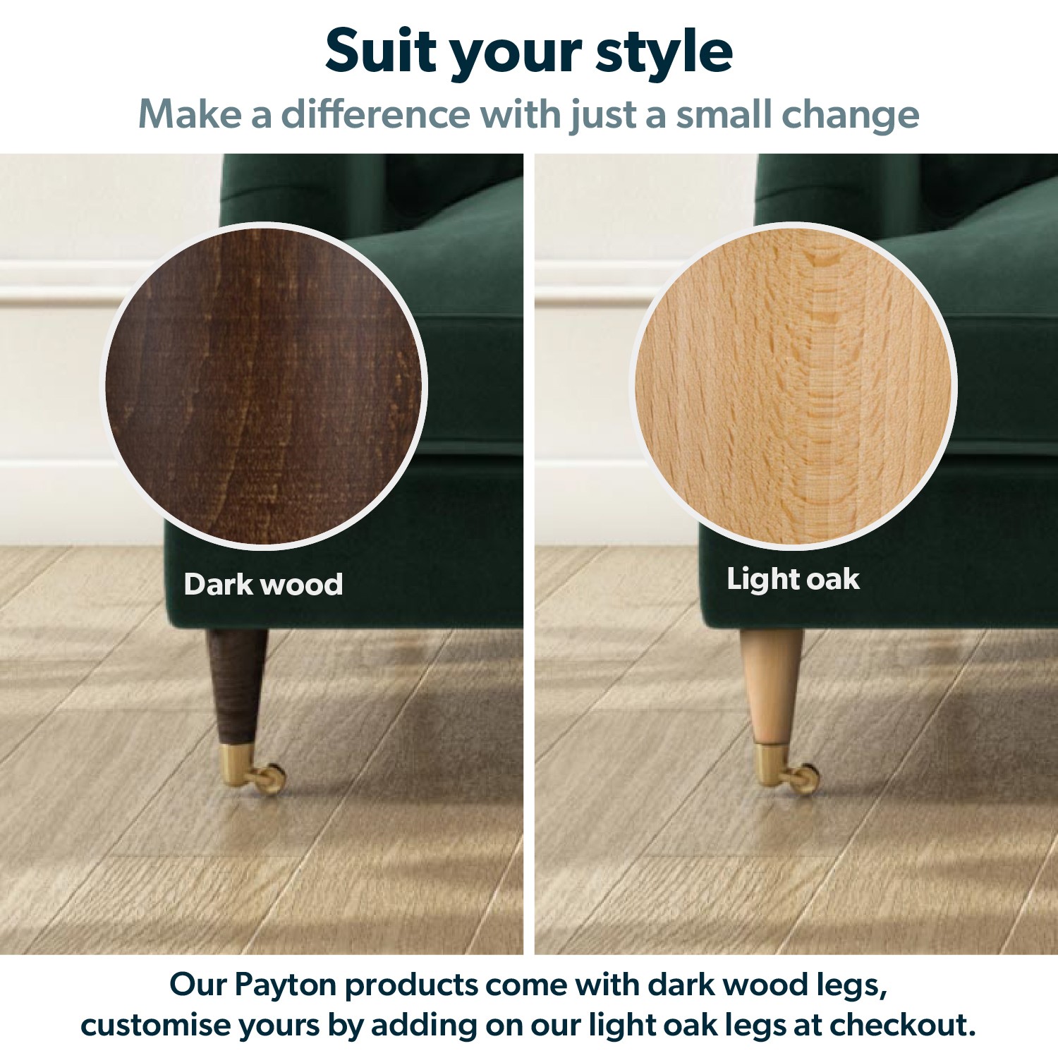 This traditional Payton sofa accommodates two people comfortably and includes two matching scatter cushions for added style and comfort. Classic ruched saddle arms and dark wood legs with gold castors complete the modern look. It’s built to last too, with a sturdy solid wood frame. Assembly is easy; simply fix the legs into position. The back and seat cushions can be removed for regular plumping, ensuring your sofa maintains maximum comfort. Light oak legs are available to purchase on this product, just add yours from our package deals, recommended accessories or at checkout. All Payton products are delivered with dark wood legs as standard.