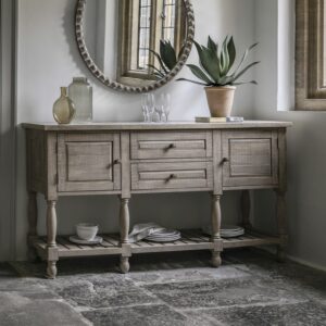 The Eliza mirror creates an exclusive industrial look with its distressed iron border frame. The smooth edges and powdered metal effect add a smart contemporary touch. Whilst the functional shelving below created an ideal place to display house plants or ornaments.
