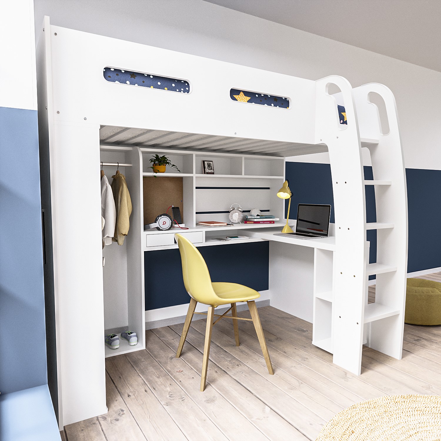 High Sleeper Loft Bed with Desk and Wardrobe in White – Carter