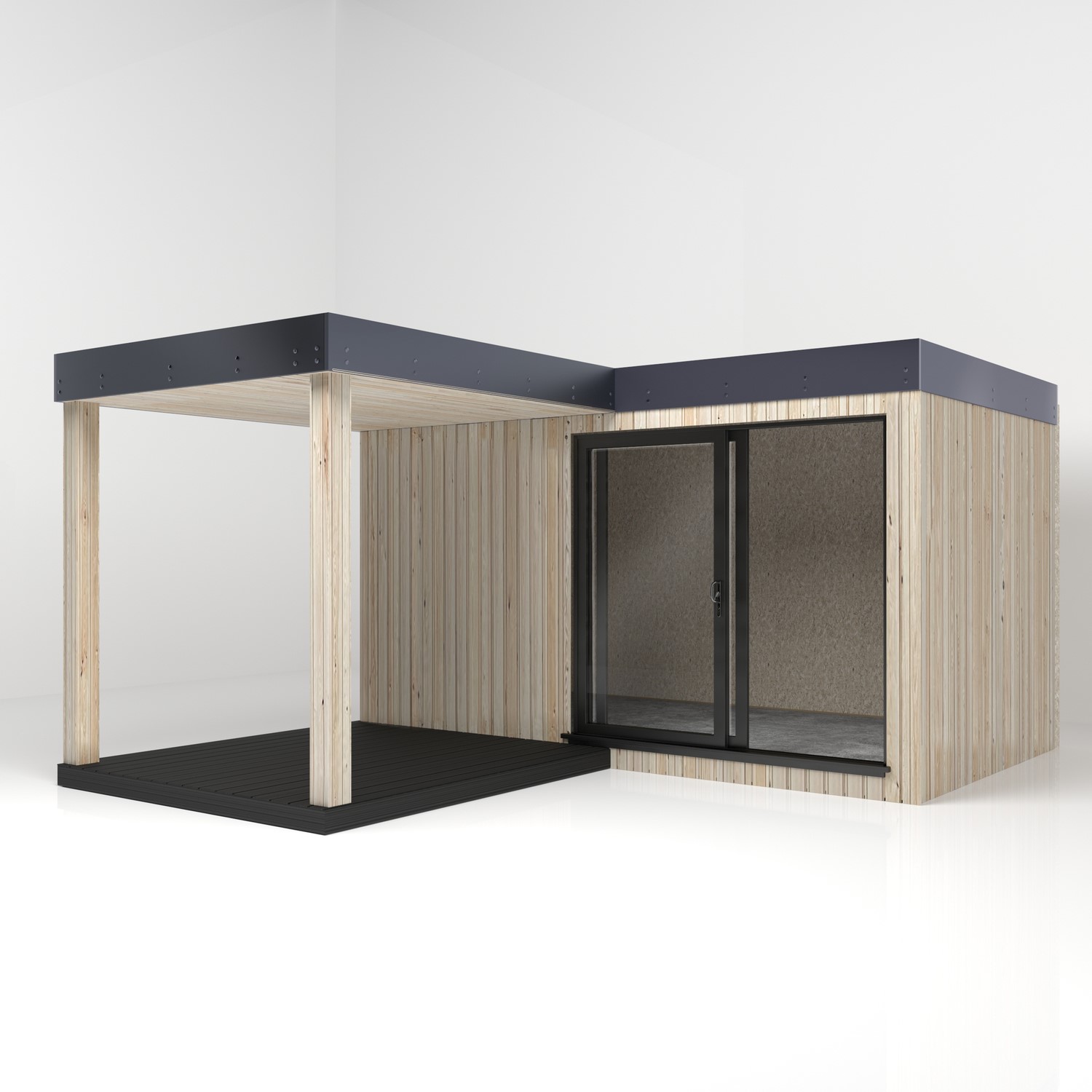 British made, with a solid timber frame and redwood tongue and groove timber cladding walls. The wall panels are fully insulated and finished, ready to install and with a blank chipboard canvas so you can create your dream room. Its pent roof has an EPDM* rubber membrane covering, which is maintenance-free, plus that’s fully insulated too. The doors are uPVC double-glazed, so you can enjoy the warmth, peace and quiet. The floor is made of mild steel, and there’s even a vermin barrier to stop any unwanted guests. Outside, there’s a hidden roof system that stops water from collecting; it’ll simply run from the sloping roof and drain via the guttering, all hidden from view. Canopy floor decking finishes it off superbly, creating its ‘L’shape. Rest assured, this is a high-quality build.