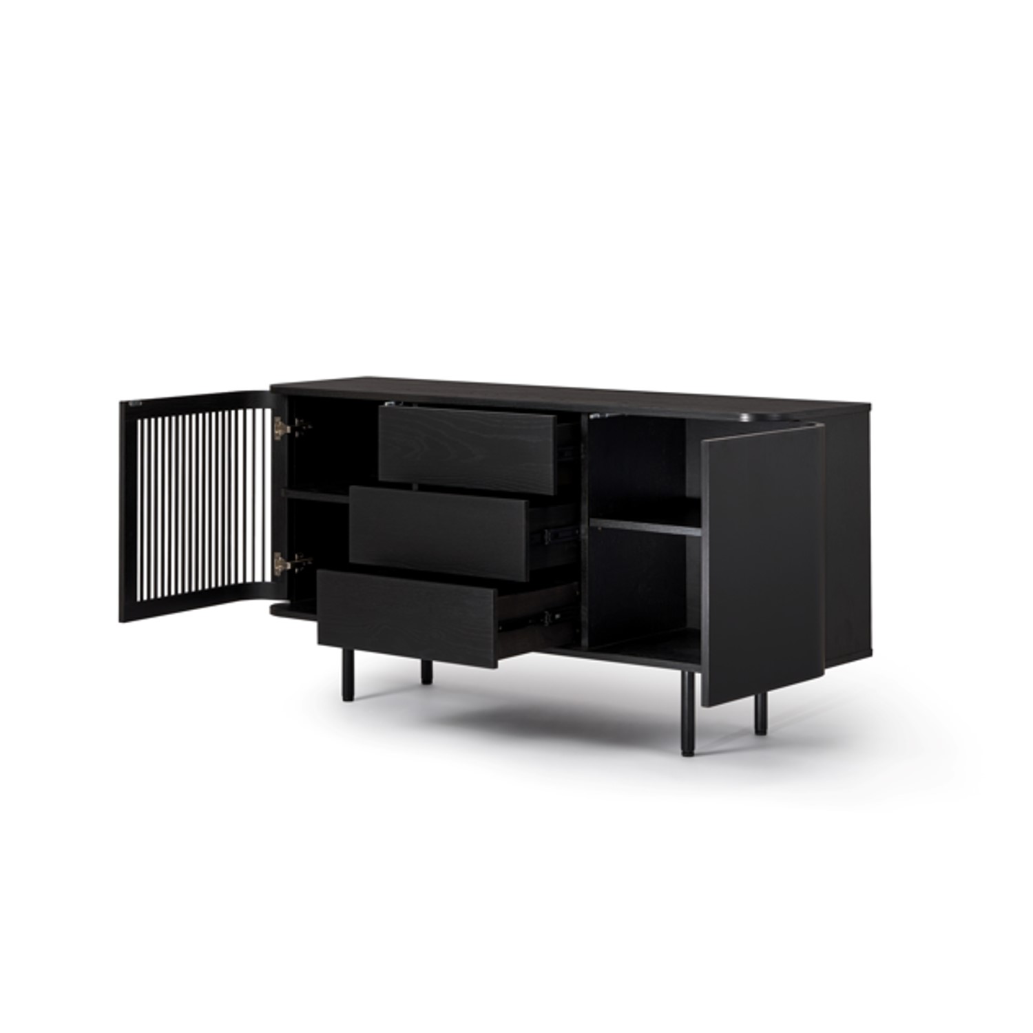 Beautiful modern black oak sideboard with an eye-catching slatted design adds a bit of glamour to any room. There are four shelves behind the two doors and all doors/drawers are soft-close. Made up of oak veneer and oak door frames, finished in black lacquer while preserving the natural look from the wood grain.
