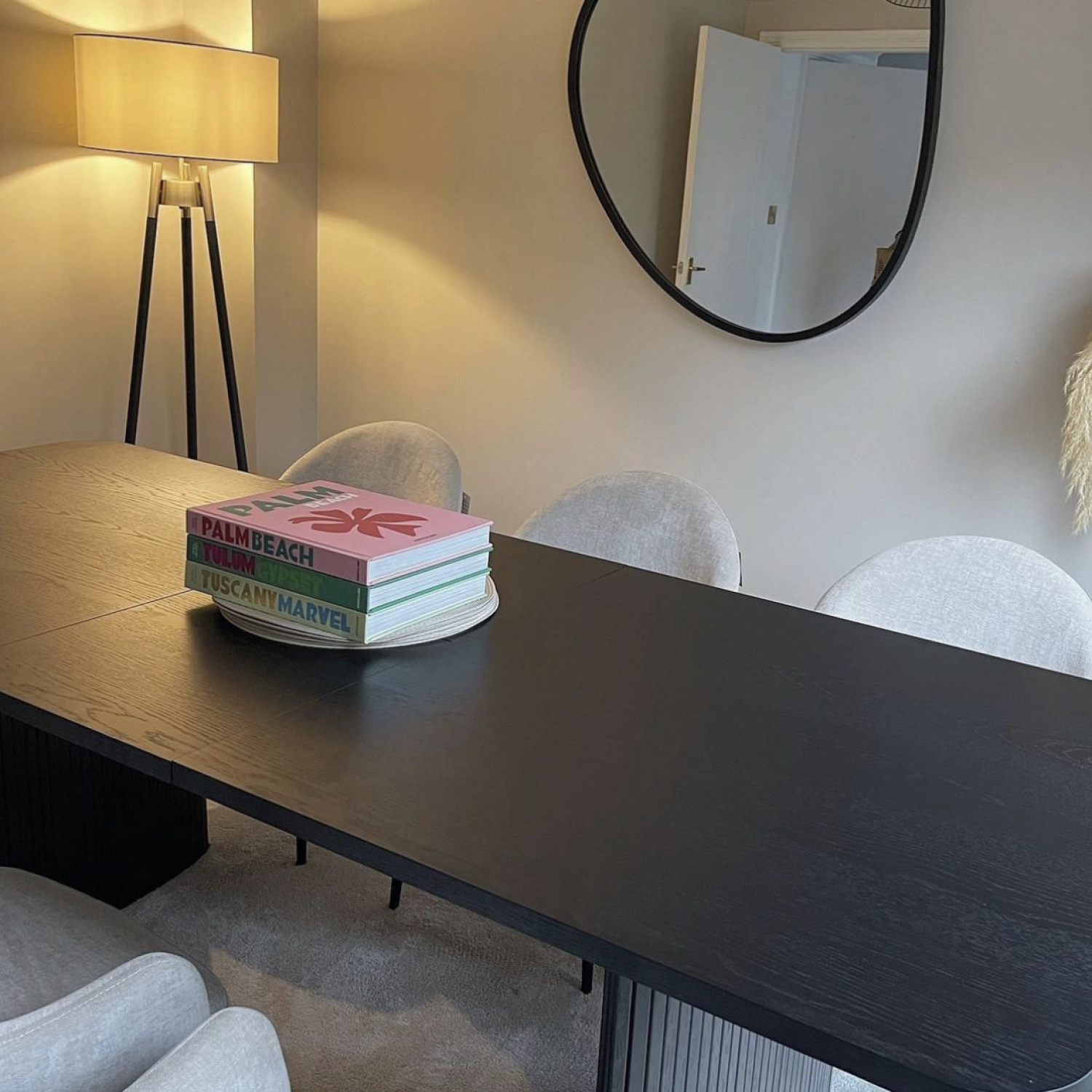Upgrade your dining space with this blackened oak extendable dining table. Creating a stylish and modern look, with a solid oak fluted leg. You can host up to 8 people comfortably around the table, perfect for dinner parties or having all the family around. The extension leaf stores inside the table for easy and convenient storage. The curved table top will suit any dining room and you can pair the table with a variety of different chairs to suit your taste.
