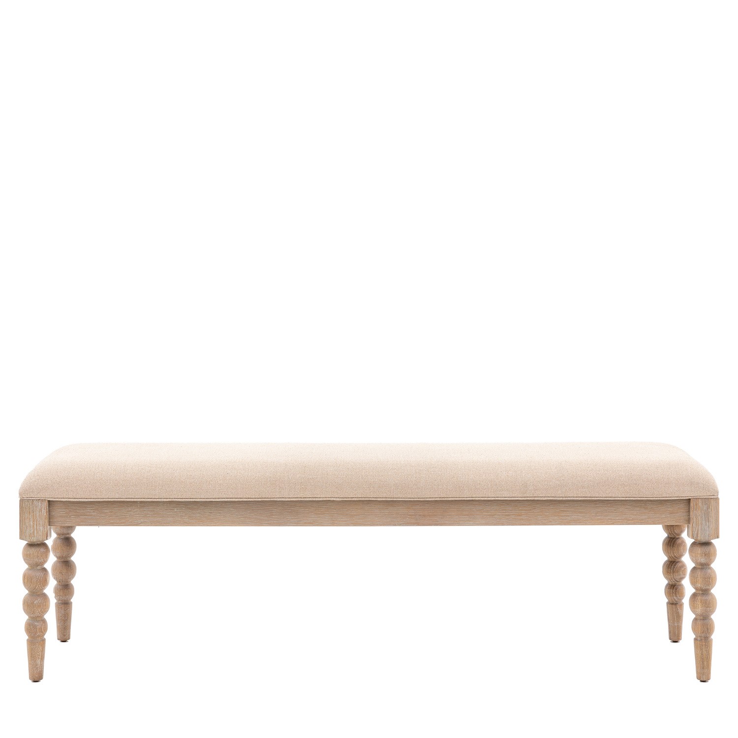 The eye-catching legs on this beautiful dining bench feature hand-crafted bobbin detail which is created by turning the wood on a lathe, a task carried out by the finest craftsmen. The bench is made from oak with a very subtle lime wash tone to the finish which is soft and mellow, paired with biscuit coloured fabric for the upholstered seat. Matching pieces are available.