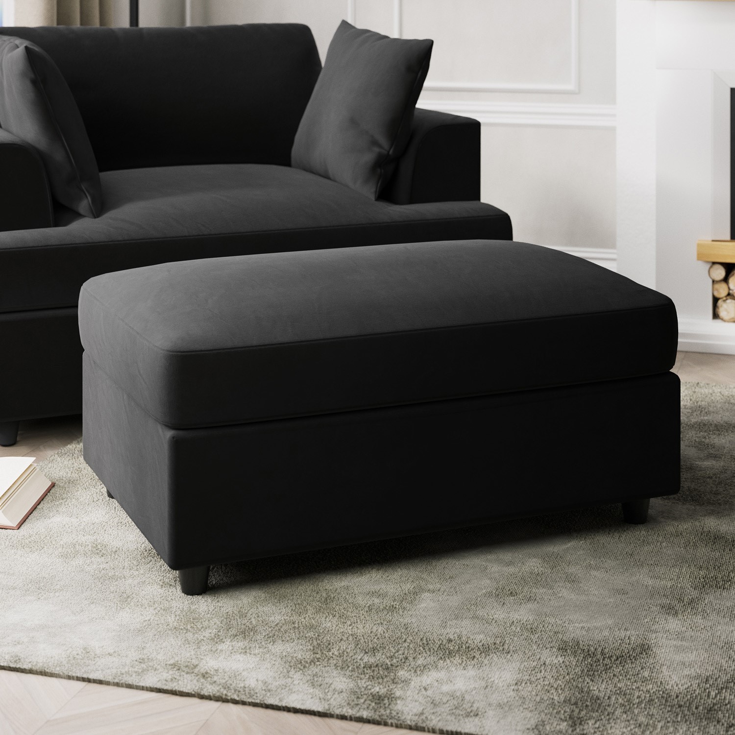 - Modern soft dark grey velvet L-shaped sofa and matching footstool set