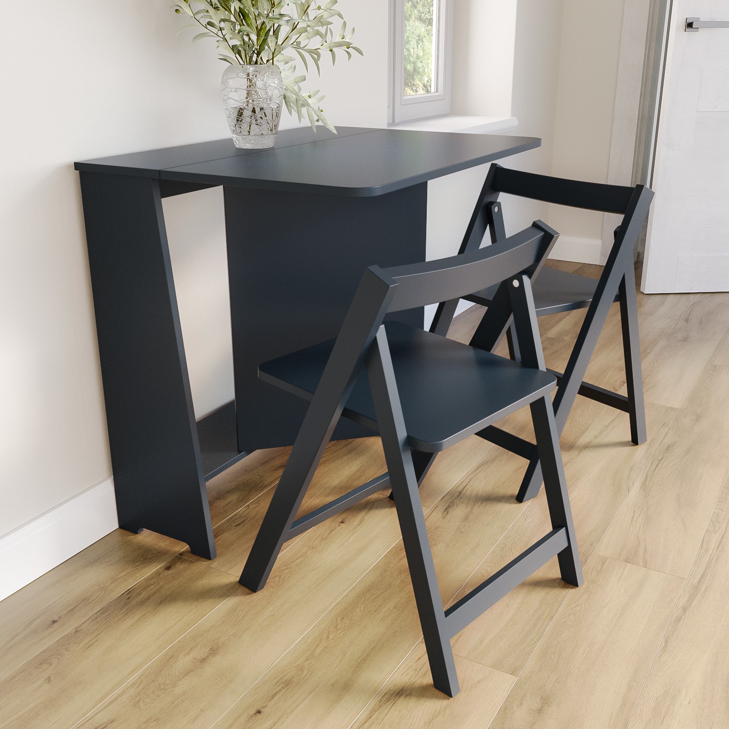 Space-Saving Design: Clever fold-away dining table with chairs that tuck neatly inside for a tidy look.