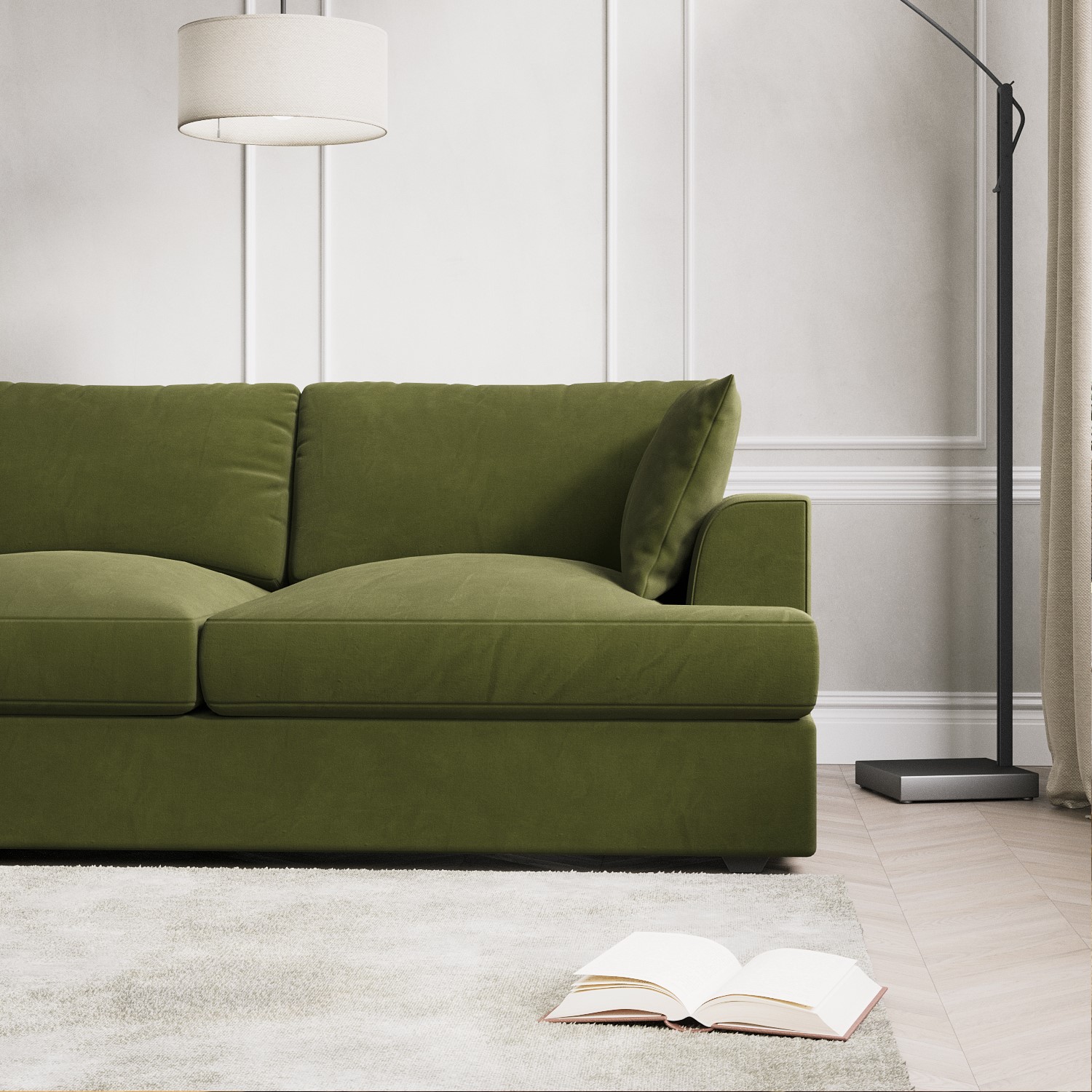 - Luxuriously soft olive green matt velvet L-shaped sofa