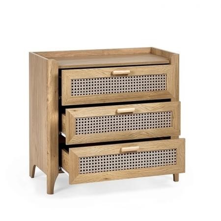 A beautifully sleek design with a bohemian feel, the Sydney 3 Drawer Chest offers exquisitely curved edging accompanied by a raised lip around the edge providing a practical addition, stunningly combined with a rattan-styled front. Finished with a natural oak effect featuring six wide drawers providing the ideal storage space for any bedding or clothing items plus extra space on top for ornaments to be placed. Creating the perfect airy, warm feel within your home.