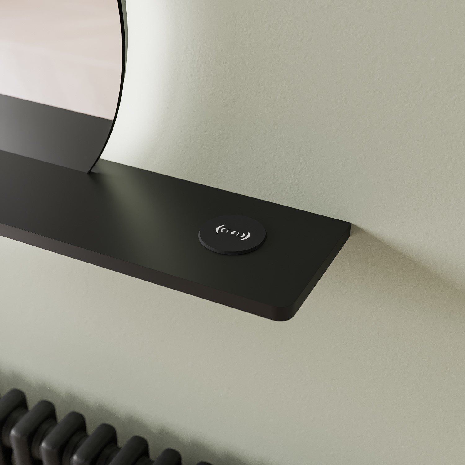 - Asymmetrical shelf has a wireless phone charging point