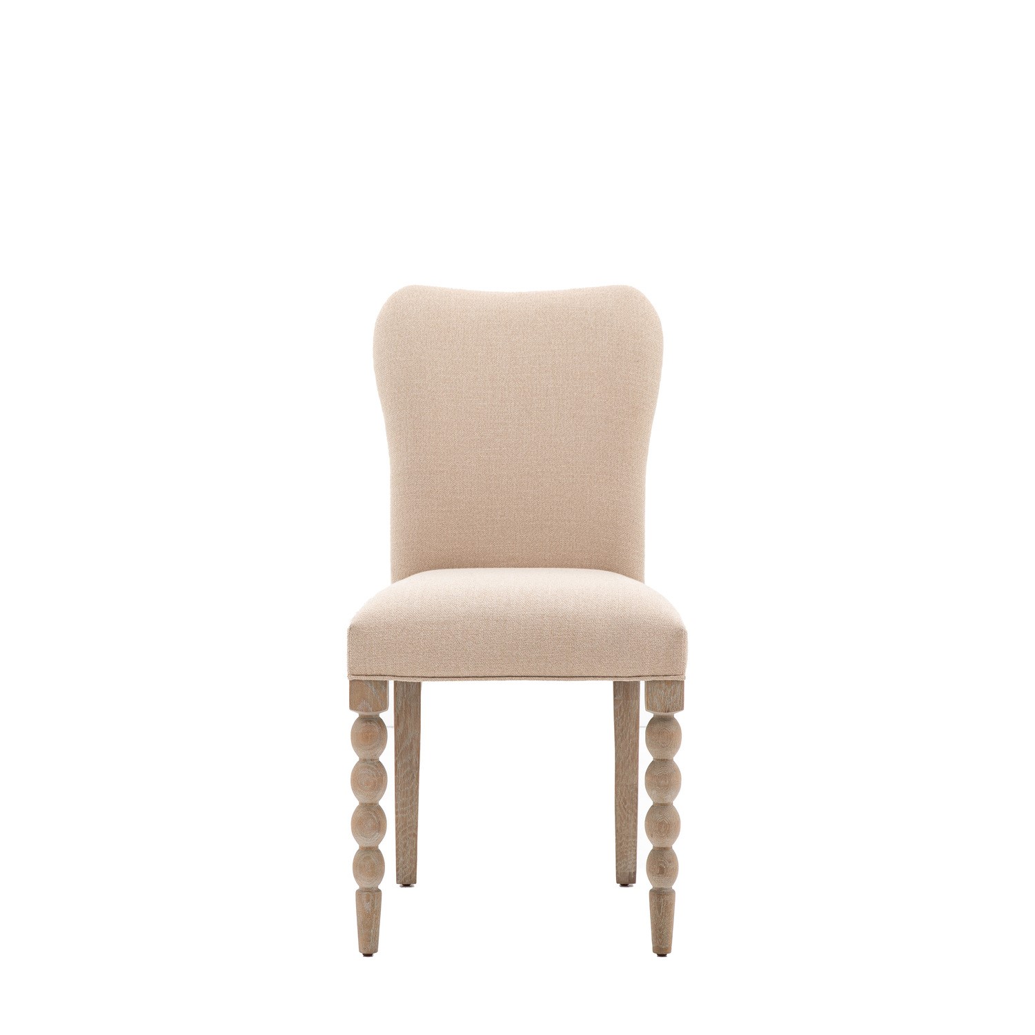Featuring a fully upholstered seat and beautiful oak legs, these stunning dining chairs will make a classy addition to any dining room. The front legs feature hand-crafted bobbin detail which is created by turning the wood on a lathe, a task carried out by the finest craftsmen. The wood has a very subtle lime wash tone to the finish which is soft and mellow, and looks beautiful paired with biscuit coloured fabric for the upholstered seat. Matching pieces are available.