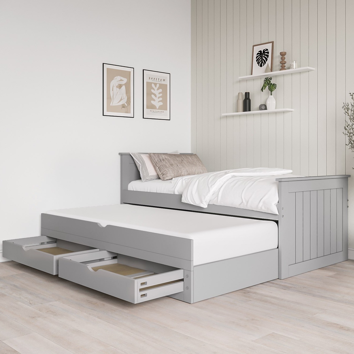 Single Grey Wooden Guest Bed with Storage and Trundle – Sander