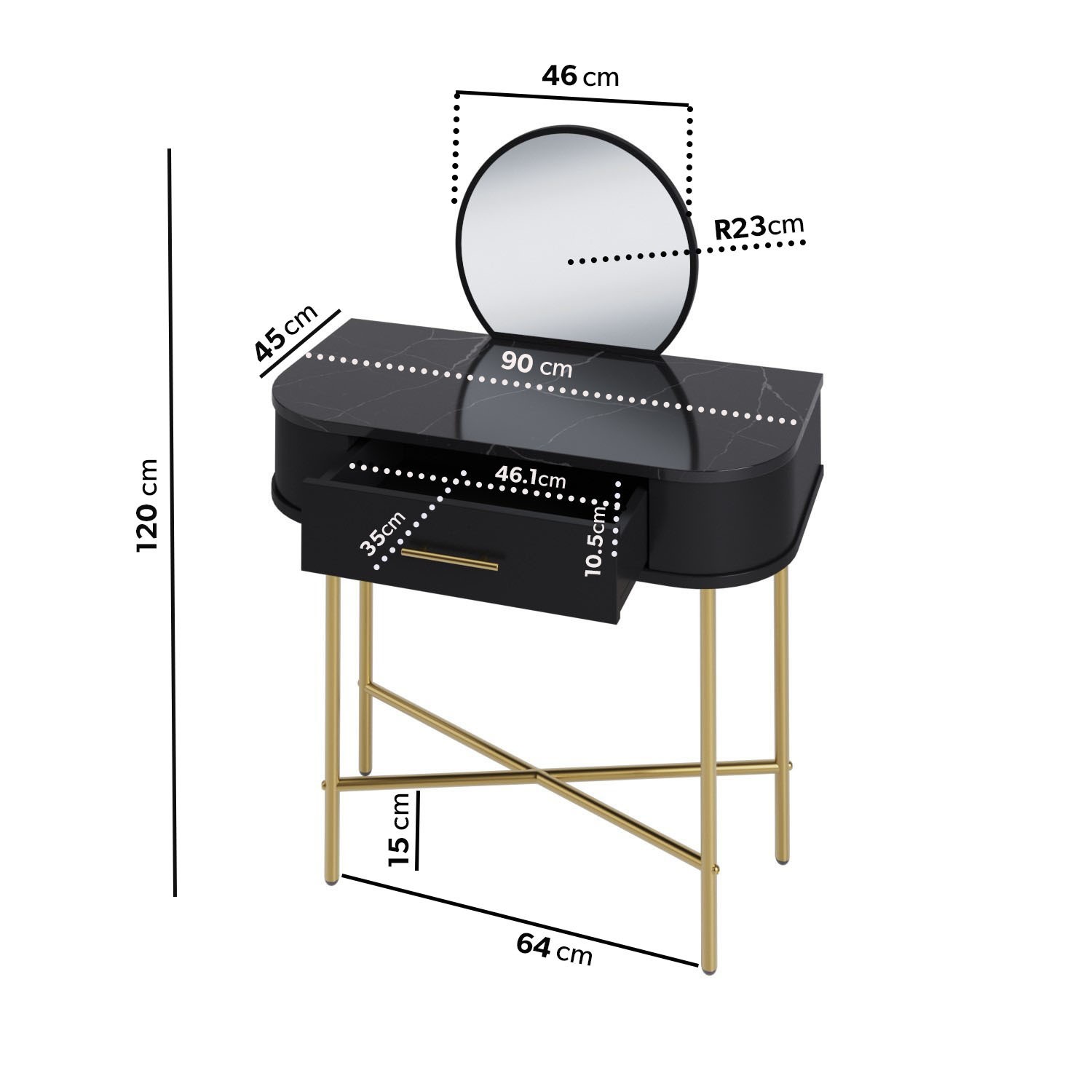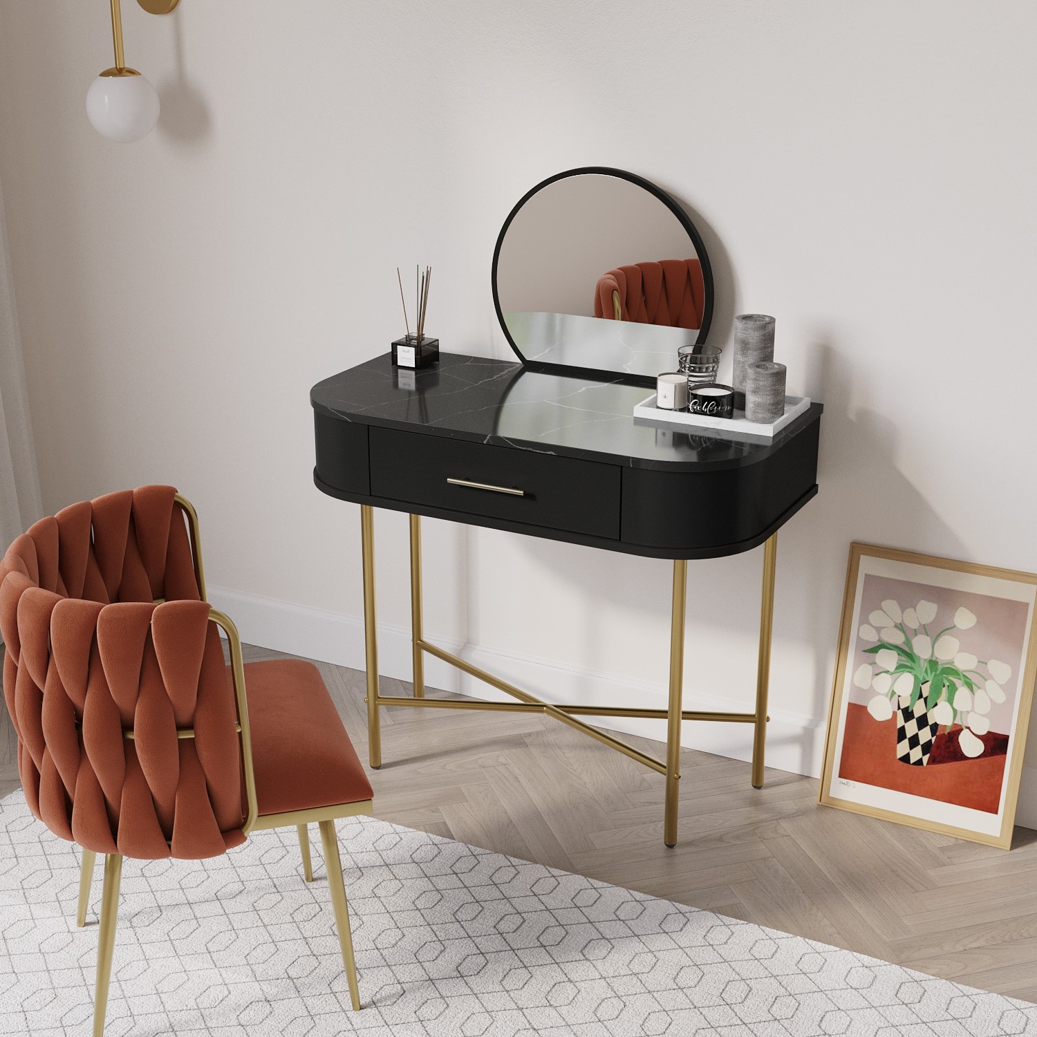 Small Black Marble Top Dressing Table With Mirror And Storage Drawer – Gigi