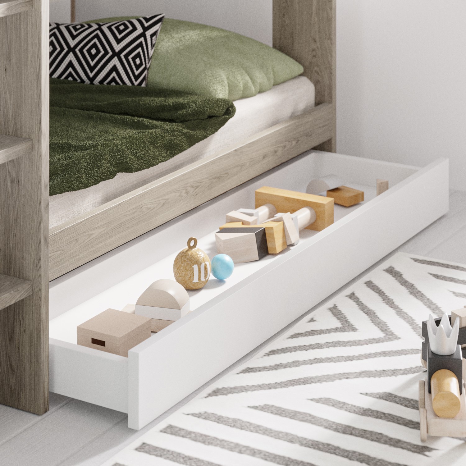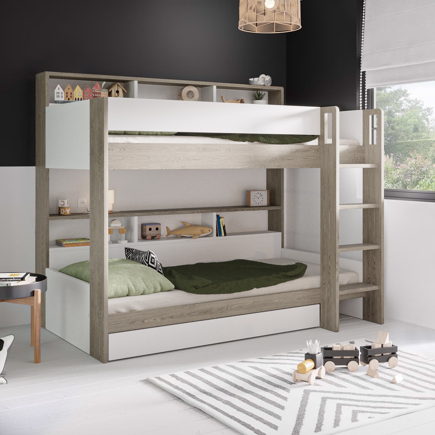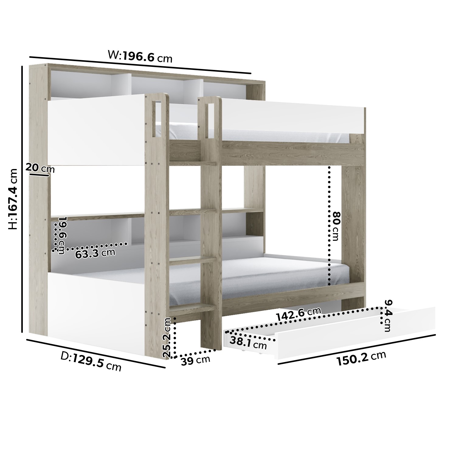 White and Oak Bunk Bed with Storage Shelves and Drawer – Aire