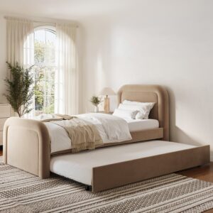 Beige Velvet Single Guest Bed with Trundle and Curved Headboard – Naomi