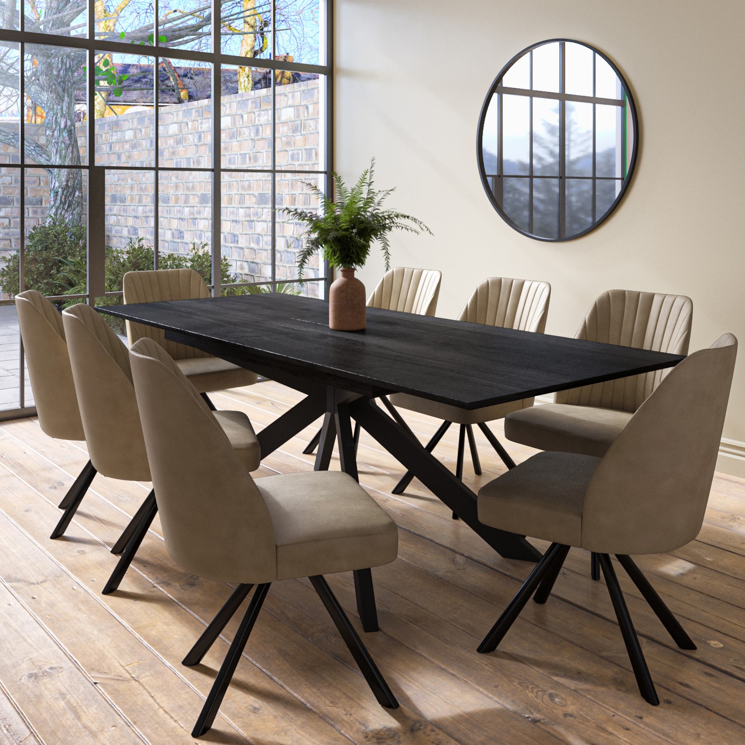 Black Extendable Dining Table Set with 8 Beige Faux Leather Swivel Chairs – Seats 8 – Carson